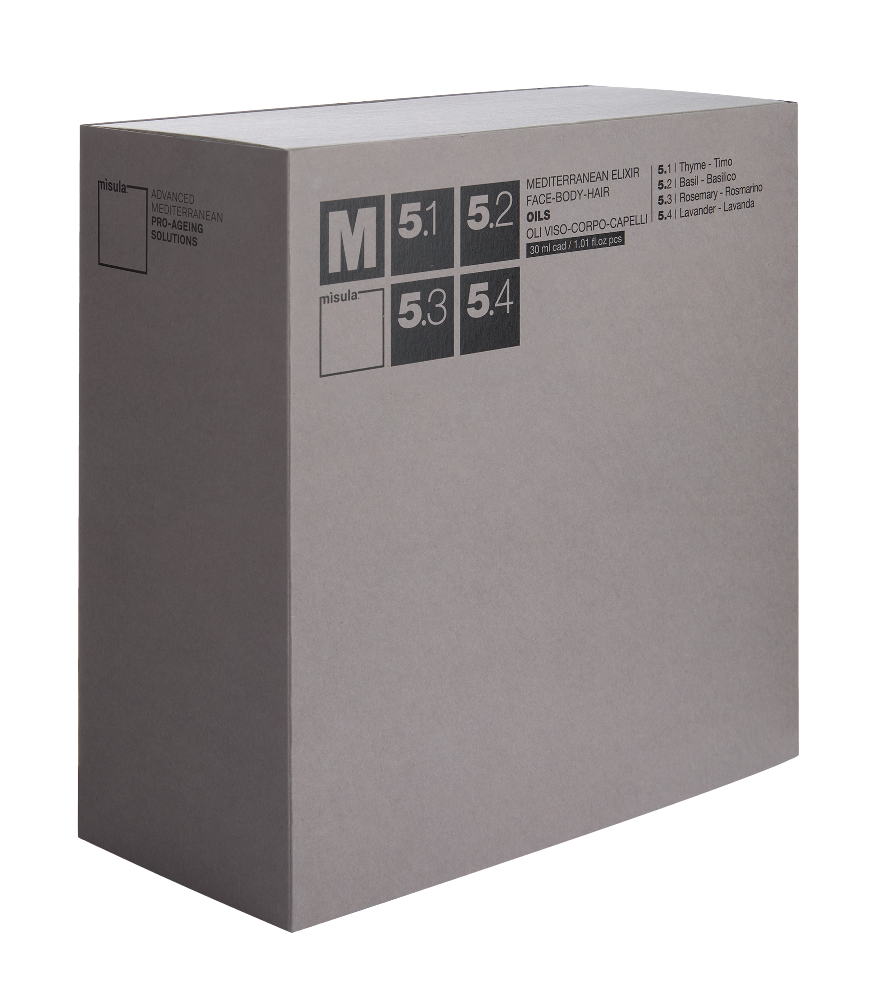 - M5.2 MEDITERRANEAN ELIXIR FACE-BOSY HAIR OILS with BASIL: purifying, soothes, and tones with an anti aging effect. Strengthens hair fibers and stimulates the scalp.